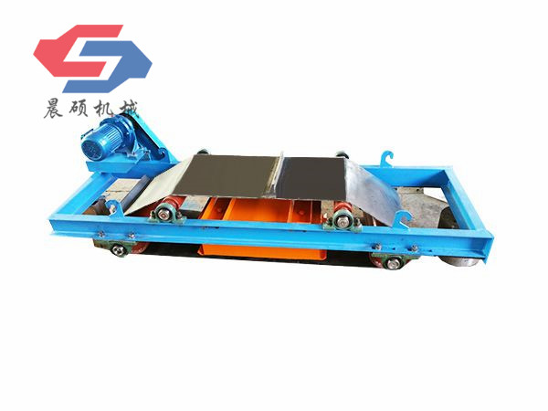 电磁除铁器的基础上增加了驱动电机、滚筒、带刮板的缷铁胶带等组成的缷铁机构。在工作过程